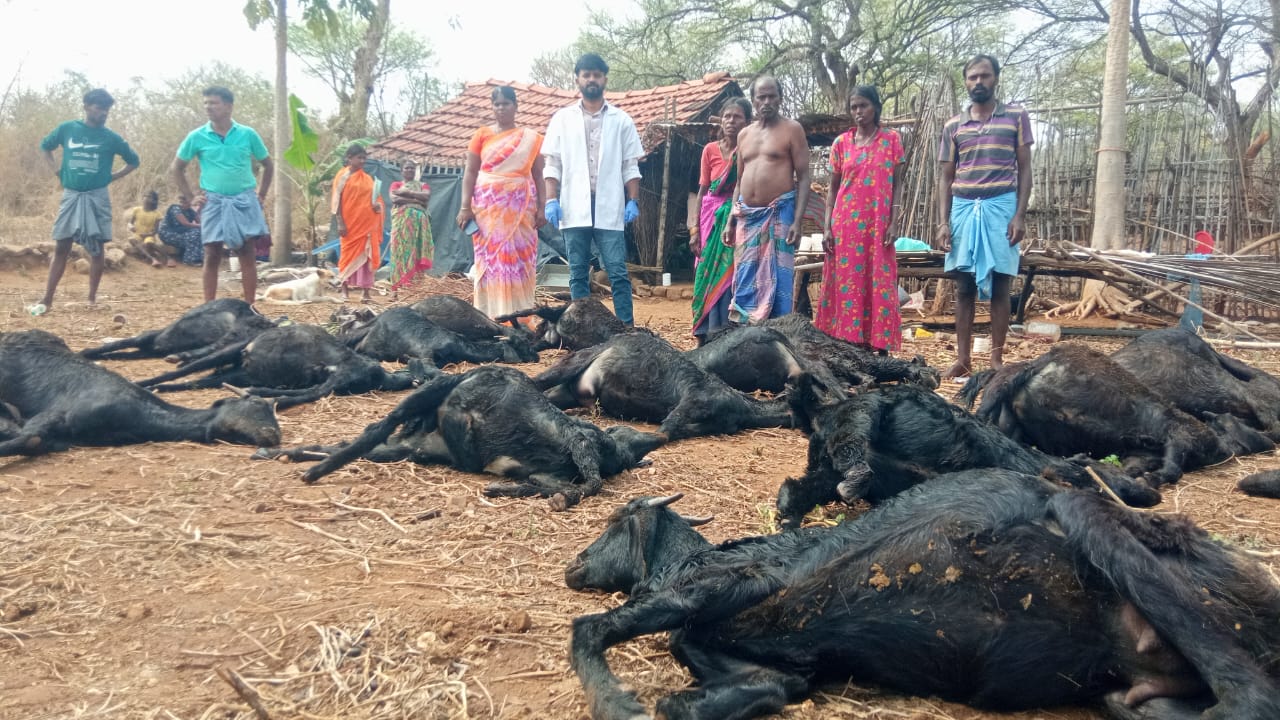 ಸಿಡಿಲು ಬಡಿದು 21 ಮೇಕೆ ಹಾಗೂ 1 ಹಸು ಧಾರುಣವಾಗಿ ಸಾವನ್ನಪ್ಪಿವೆ. ಕರ್ನಾಟಕ ತಮಿಳುನಾಡು ಗಡಿಭಾಗದ ಅಂಚೆಟ್ಟಿ ಗ್ರಾಮದ ಬಳಿ ಇಂದು ಘಟನೆ ನಡೆದಿದೆ. ಗ್ರಾಮದ ಹಿರೇಗೌಡರ್ ತಮ್ಮ ಜಮೀನಿನಲ್ಲಿ ಹಸು ಹಾಗೂ ಮೇಕೆಗಳನ್ನು ಸಾಕಿದ್ದರು. ಮಳೆ ಬಂದು ಸಿಡಿಲಿನ ಹೊಡೆತಕ್ಕೆ ಜಮೀನಿನಲ್ಲಿ ಸಾಕಿದ್ದ ಹಸು ಹಾಗೂ ಮೇಕೆಗಳು ದಾರುಣವಾಗಿ ಸಾವನ್ನಪ್ಪಿವೆ. ಸ್ಥಳಕ್ಕೆ ಪಶುವೈದ್ಯಾಧಿಕಾರಿಗಳು ಭೇಟಿ ನೀಡಿ ಪರಿಶೀಲನೆ ನಡೆಸಿದರು. ರೈತ ಹಿರೇಗೌಡರಿಗೆ ಸೂಕ್ತ ಪರಿಹಾರವನ್ನು ನೀಡುವಂತೆ ಗ್ರಾಮಸ್ಥರು ಅಗ್ರಹಿಸಿದರು.