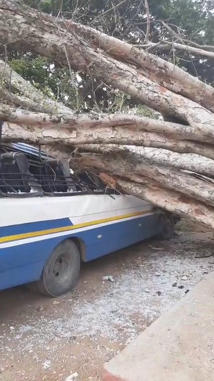 ಮರ ಕೆಳಗೆ ಬಿದ್ದ ಪರಿಣಾಮ ಮರದ ಕೆಳಗೆ ನಿಲ್ಲಿಸಿದ್ದ ಎರಡು ಬಸ್ ಸೇರಿದಂತೆ ನಾಲ್ಕು ವಾಹನಗಳು ಜಖಂ ಆಗಿದೆ.