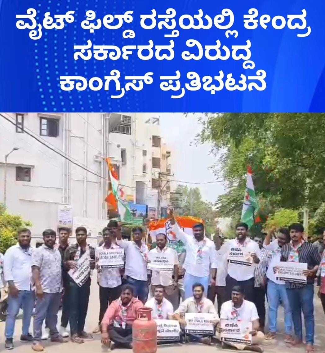 ಮಹದೇವಪುರ ವಿಧಾನಸಭಾ ಕ್ಷೇತ್ರದ ವೈಟ್ ಫೀಲ್ಡ್ ಮುಖ್ಯ ರಸ್ತೆಯಲ್ಲಿ ಕೇಂದ್ರ ಸರ್ಕಾರದ ಬೆಲೆ ಏರಿಕೆ ಖಂಡಿಸಿ ಯೂತ್ ಕಾಂಗ್ರೆಸ್ ಕಾರ್ಯಕರ್ತರು ಪ್ರತಿಭಟನೆ ನಡೆಸಿದರು.