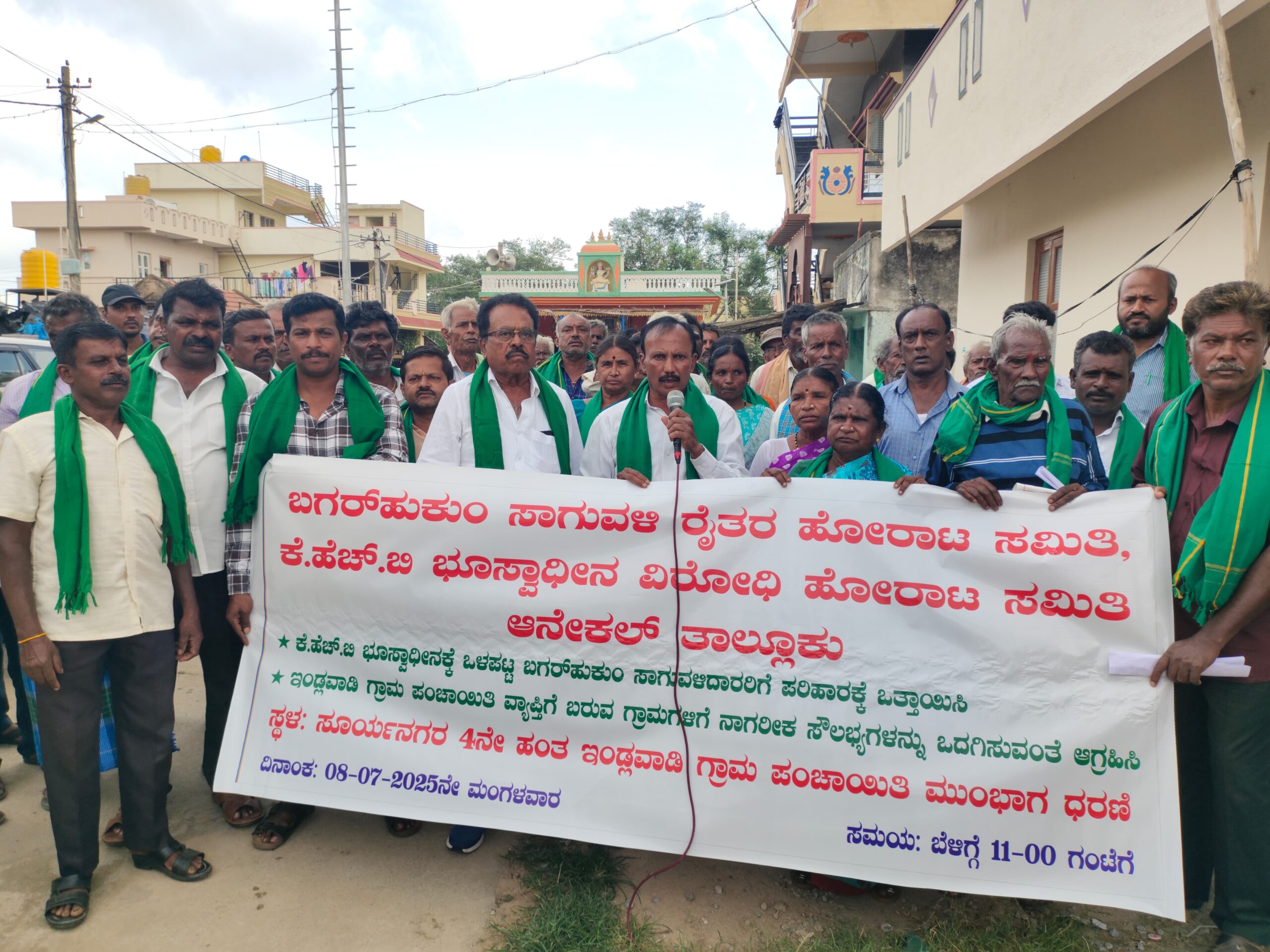 ಆನೇಕಲ್ ತಾಲೂಕಿನ ಇಂಡ್ಲವಾಡಿ ಪಂಚಾಯತಿ ವ್ಯಾಪ್ತಿಯಲ್ಲಿ ನಿರ್ಮಾಣವಾಗುತ್ತಿರುವ ಕರ್ನಾಟಕ ಮಂಡಳಿಯ ಸೂರ್ಯ ಸಿಟಿ ನಾಲ್ಕನೇ ಹಂತದಲ್ಲಿ ಬಗರ್ ಹುಕುಂ ಸಾಗುವಳಿ ಮಾಡುವ ರೈತರಿಗೆ ಅನ್ಯಾಯವಾಗುತ್ತಿದೆ ಎಂದು ಆರೋಪಿಸಿ ಬಗರ್ ಹುಕುಂ ಸಾಗುವಳಿ ರೈತರ ಹೋರಾಟ ಸಮಿತಿ ವತಿಯಿಂದ ಪ್ರತಿಭಟನೆ ನಡೆಸಲಾಯಿತು